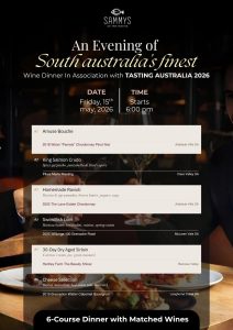 Join us for an elegant evening celebrating the finest wines and flavors of South Australia at Sammys on the Marina. This exclusive wine dinner, held in association with Tasting Australia 2026, offers a thoughtfully curated 6-course menu paired perfectly with premium wines from renowned regions like Adelaide Hills, Clare Valley, and Barossa Valley.